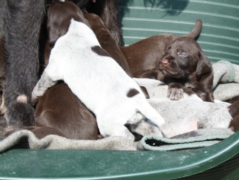 Der Welpenauslauf steht, nur fressen und laufen wollen die Kleinen noch nicht so richtig. Ein gutes Zeichen dafür, dass die Hündin alles im Griff hat.